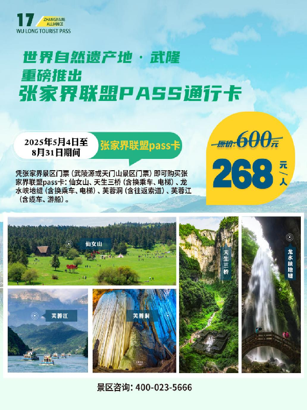 截止至8月31日,憑張家界、武陵源或天門山景區(qū)門票,憑票就能以268元/人的優(yōu)惠價(jià)暢玩武隆核心景區(qū)。