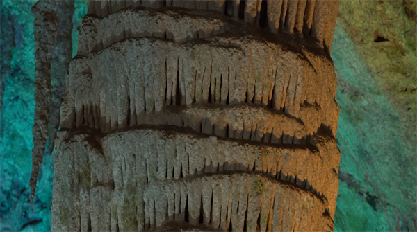 石筍表面布滿類似棕櫚樹皮的放射狀紋路,這是“飛濺水沉積”的典型標志。當水滴從高處濺落,水花帶出的鈣質以中心向外擴散結晶,形成了如塔檐層疊、斗拱支撐一般的精細結構。這是純粹物理過程創(chuàng)造的意外之“精致”。