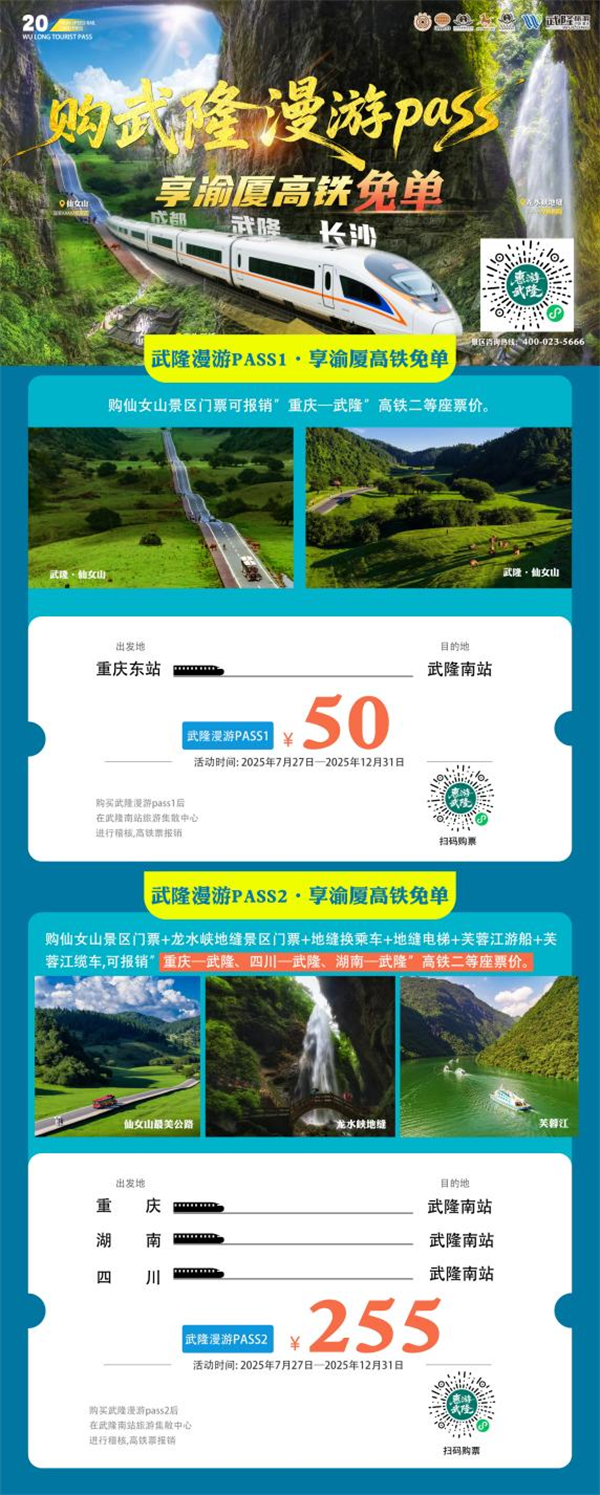 “仙女體驗卡”福利解鎖:購買漫游PASS2“仙女山+龍水峽地縫+芙蓉江”套票,可報銷川渝湘至武隆的高鐵票!購買漫游PASS1“仙女山”門票,即可報銷"重慶-武隆"段高鐵票。仿佛拿到童話世界的通關(guān)文牒~
