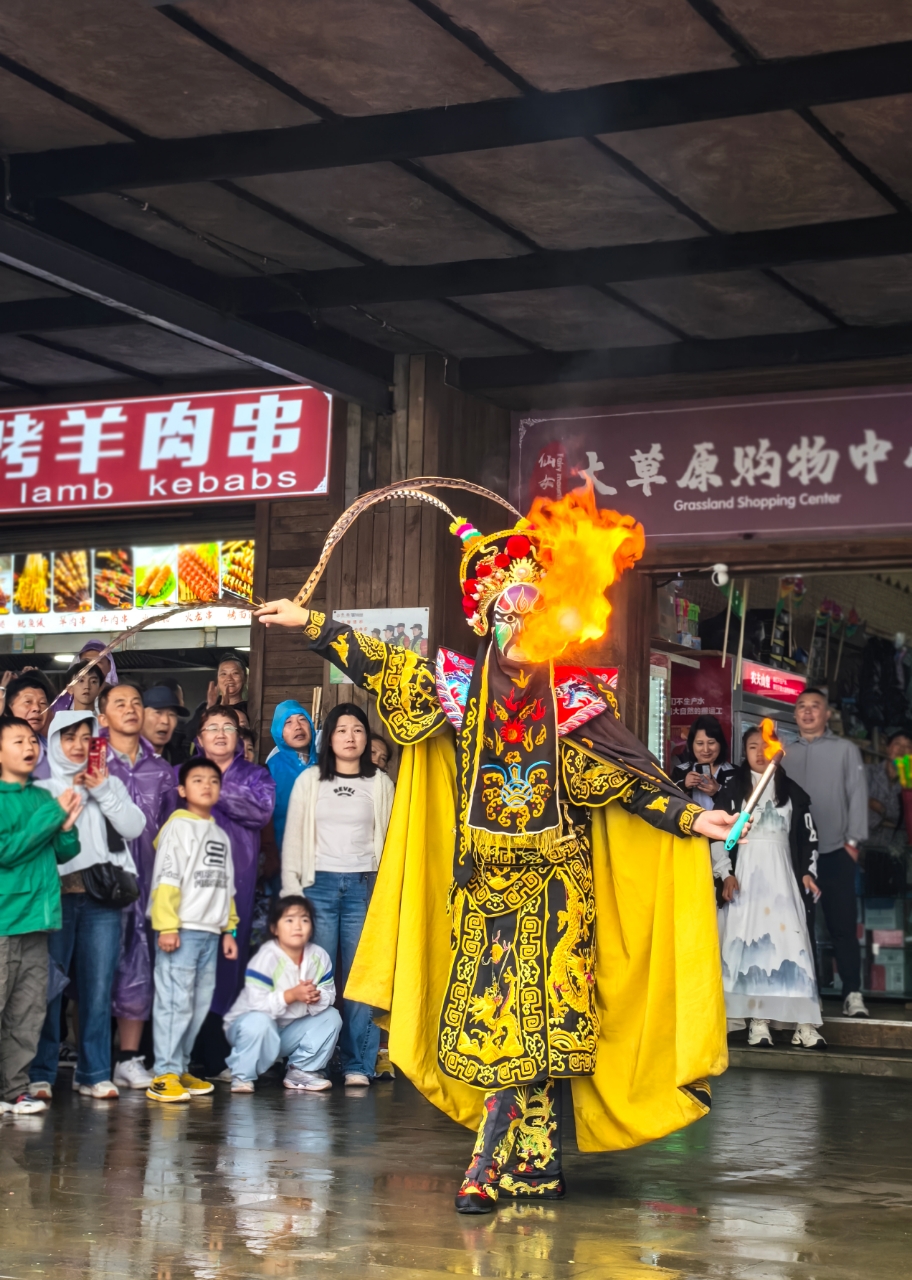 非遺展演區(qū)入口掛著 “非遺賀國慶” 橫幅,川渝變臉?biāo)嚾说? “九變” 絕技融入紅色臉譜,變臉間隙比出 “國慶快樂” 手勢;噴火表演時,火焰映著周邊小國旗,引得孩童拽著家長蹦跳,藝人下臺還為孩童貼國旗貼紙。