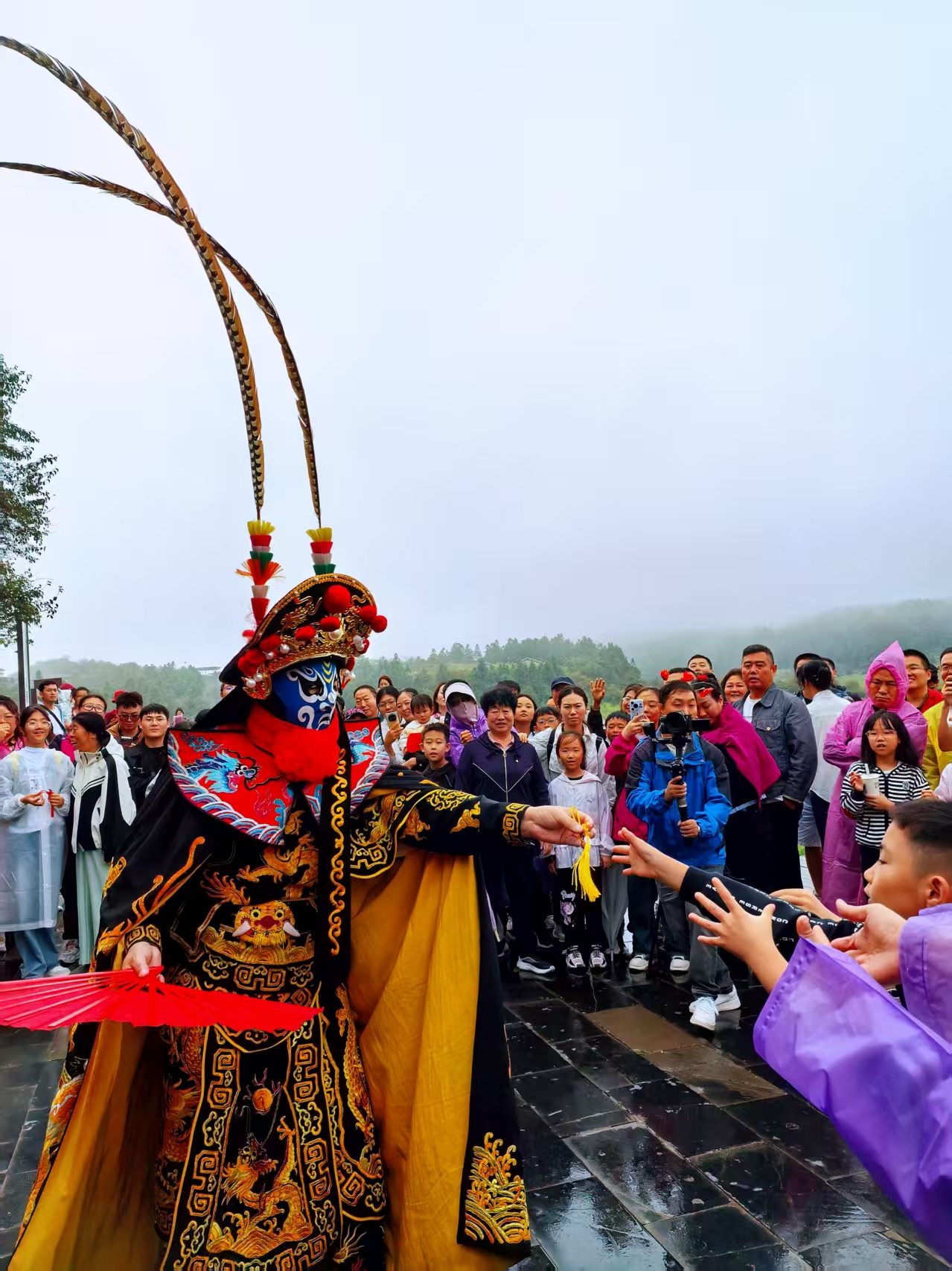 五大國潮活動成 “人氣磁場”:仙女山景區(qū),《麗人行》舞者剛謝幕,工作人員便擺出裝滿小國旗、“愛心” 貼紙、國旗發(fā)夾的禮品桌,孩子們圍攏領(lǐng)取,成年人舉旗與舞者同框,紅旗下,草甸金黃與舞者朱紅裙擺相映成趣。