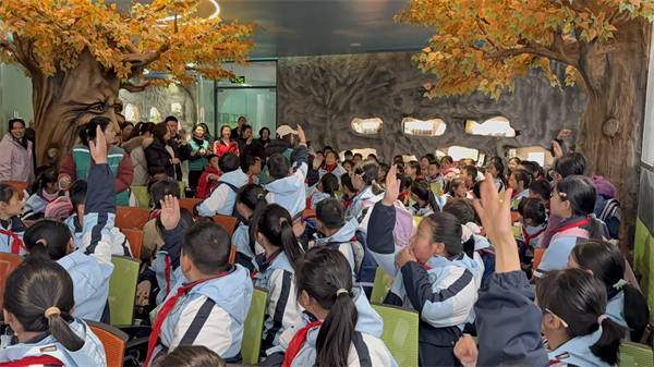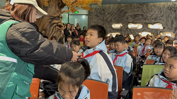 視頻播放完畢,趣味知識(shí)問(wèn)答環(huán)節(jié)火熱上線!主持人拋出一個(gè)個(gè)“航天+地質(zhì)”小問(wèn)題:“航天員為啥要在洞穴里訓(xùn)練?”“航天員們?cè)诙囱ɡ镞M(jìn)行了哪些訓(xùn)練?” “航天員在洞穴里面訓(xùn)練了多久?”孩子們瞬間化身“答題小能手”,小手舉得比誰(shuí)都高,搶答聲、歡呼聲此起彼伏。答對(duì)的同學(xué)收獲愛(ài)心保溫杯,沒(méi)搶到的也不甘示弱,摩拳擦掌等著下一題,現(xiàn)場(chǎng)氣氛直接拉滿(mǎn)!