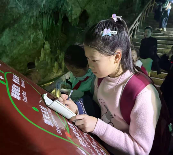 活動(dòng)的高潮,從踏入芙蓉洞的那一刻正式拉開(kāi)!孩子們兵分兩路化身“小小地質(zhì)學(xué)家”,跟著專(zhuān)業(yè)講解員開(kāi)啟探秘模式。他們仰頭觀察千姿百態(tài)的鐘乳石與石筍,觸摸巖壁上水流侵蝕的痕跡,認(rèn)真記錄喀斯特地貌的形成過(guò)程,沉浸式完成探究任務(wù)。