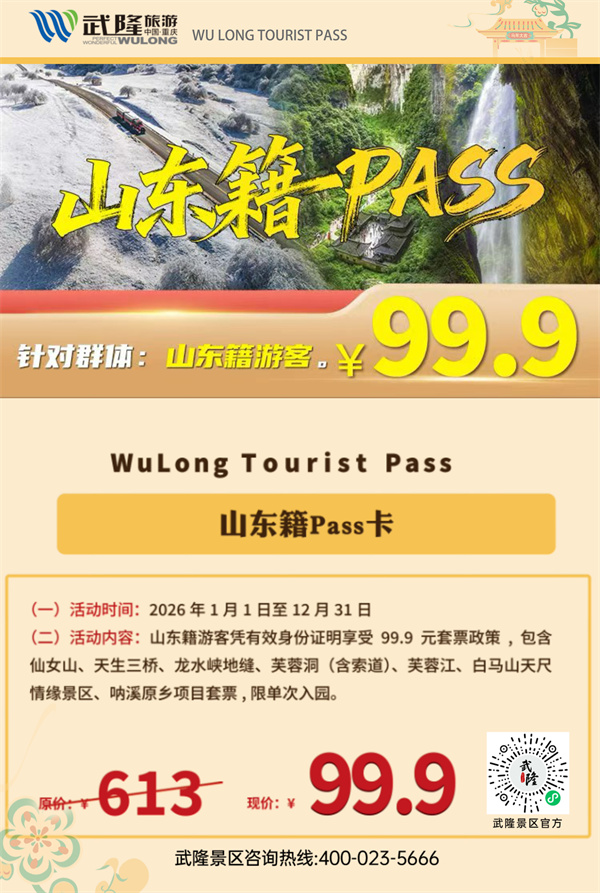 2026年,武隆景區(qū)直接甩出一波“硬核寵粉”操作:用一張99.9元的“山東籍Pass卡”,把考場的緊張卷成仙女山的清風(fēng),讓申論的墨香化作峽谷的溪流!