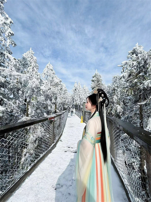 樹頂漫步:站在觀景臺上,身著古裝,背后是連綿的雪山和茫茫的林海雪原,震撼的場景非常適合拍照。
